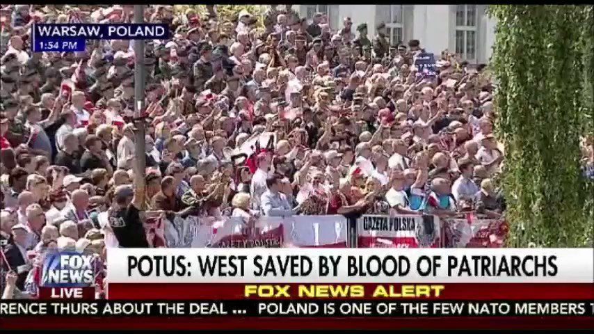 | Đám đông tại Balan ca hát 'Donald Trump' sau khi tổng thống Hoa Kỳ tuyên bố "The West will never, ever be broken. Our values will prevail." |